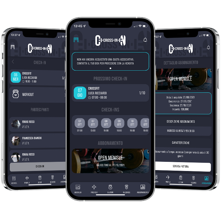 Cross-In nasce come soluzione semplice e potente per gestire un box di CrossFit e per fornire agli atleti un’app dedicata: monitoraggio degli allenamenti, acquisto o rinnovo dell’abbonamento, check-in e comunicazioni dirette con il box.